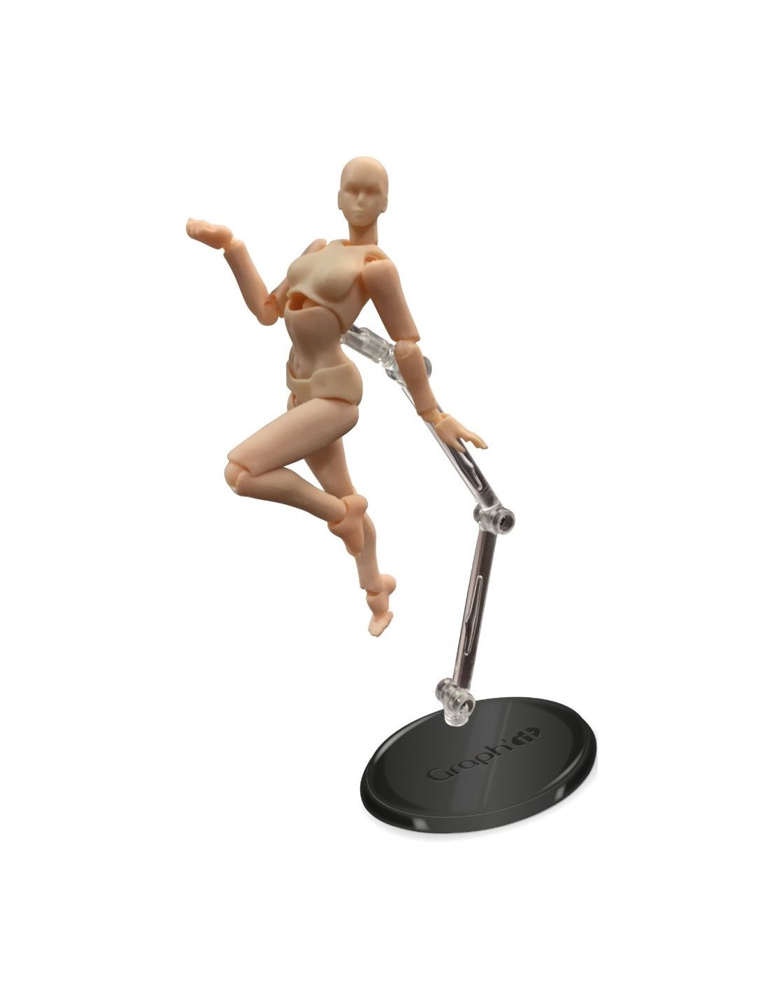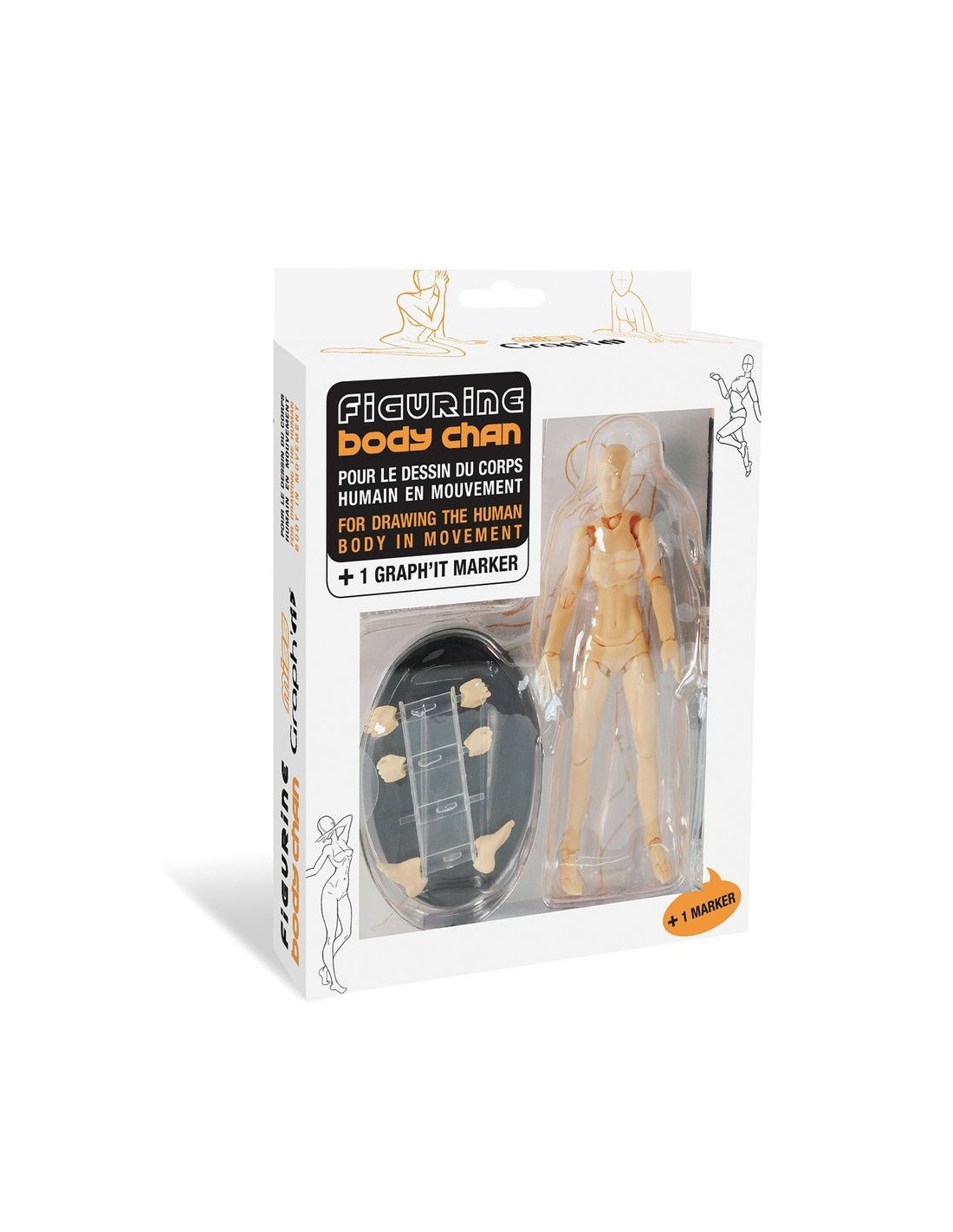 MISS GRAPH'IT, figurina articolata dalla silhouette realistica sarà la tua alleata per i tuoi disegni manga, styling, fumetti... In plastica stampata con viso, muscolatura, 18 punti di articolazione e 30 assi di rotazione, MISS GRAPH'IT diventerà rapidamente essenziale per i vostri disegni del corpo umano in movimento e per riprodurre con realismo un'infinità di pose, da solo o in duo con il suo partner MISTER GRAPH'IT. Questo set completo contiene una figura articolata Body Kun o Body Chan + 2 paia di mani + 1 paio di piedi + una base pesata per sostenere la figurina + 1 GRAPH'IT MARKER di colore carne + un manuale utente dettagliato con esempi passo-passo.