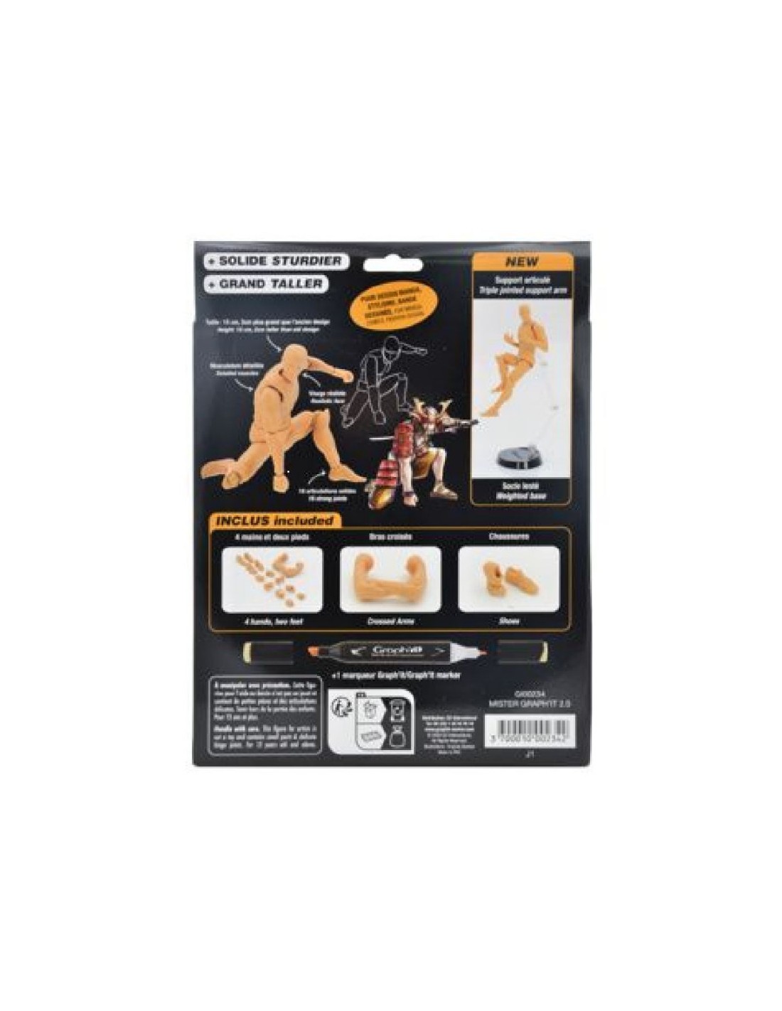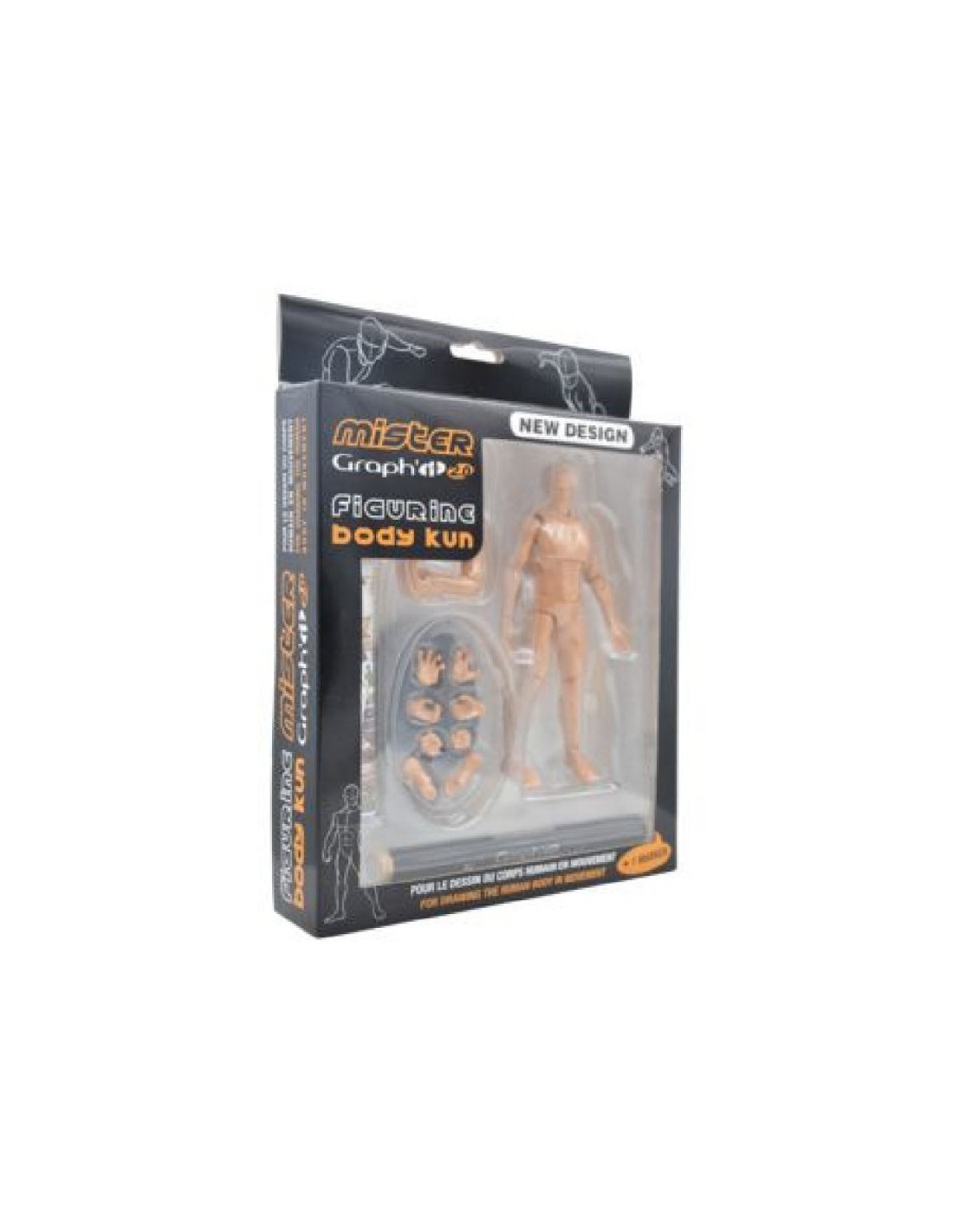 MISTER GRAPH'IT, figurina articolata dalla silhouette realistica sarà la tua alleata per i tuoi disegni manga, styling, fumetti... In plastica stampata con viso, muscolatura, 18 punti di articolazione e 30 assi di rotazione, MISS GRAPH'IT diventerà rapidamente essenziale per i vostri disegni del corpo umano in movimento e per riprodurre con realismo un'infinità di pose, da solo o in duo con il suo partner MISTER GRAPH'IT. Questo set completo contiene una figura articolata Body Kun o Body Chan + 2 paia di mani + 1 paio di piedi + una base pesata per sostenere la figurina + 1 GRAPH'IT MARKER di colore carne + un manuale utente dettagliato con esempi passo-passo.
