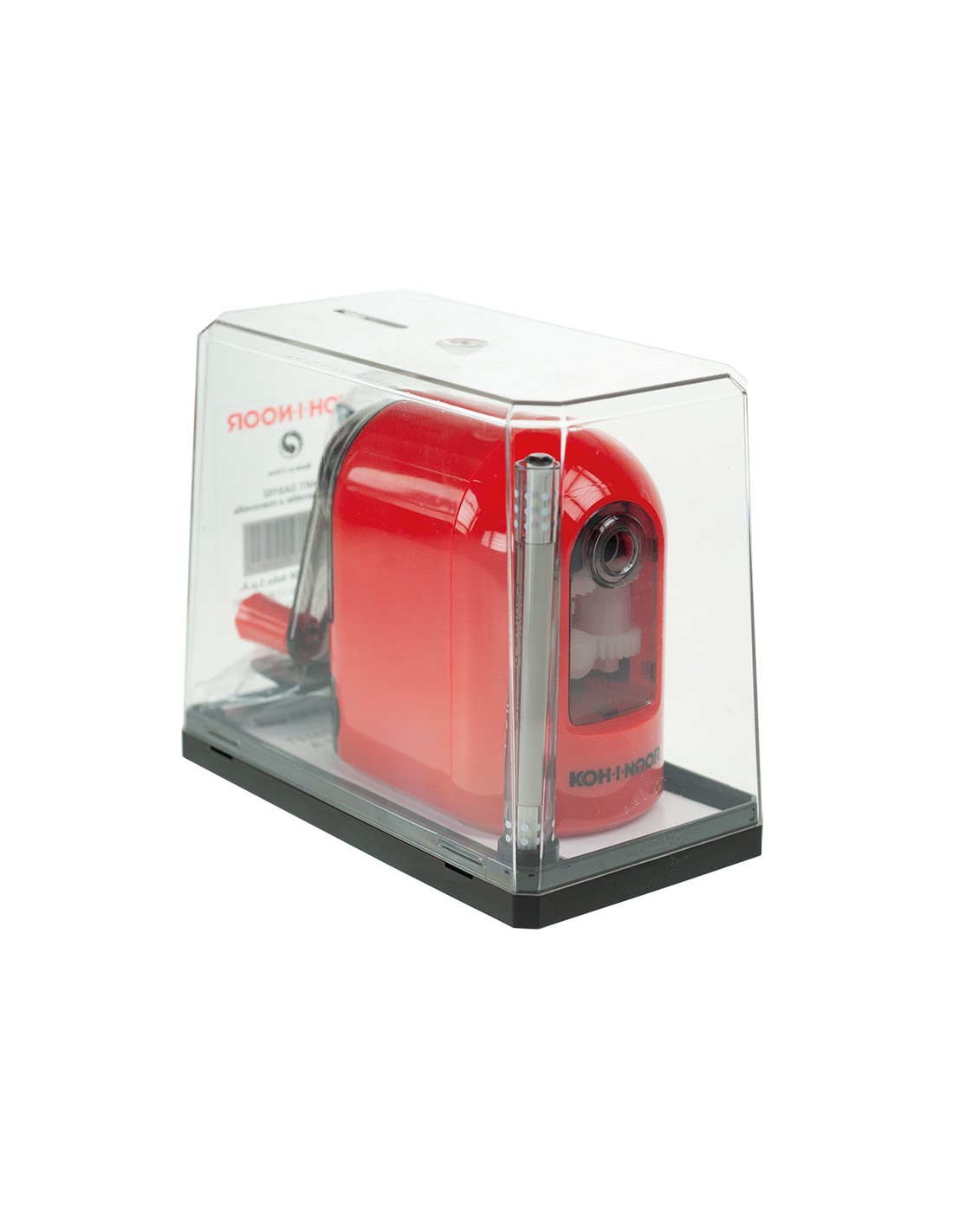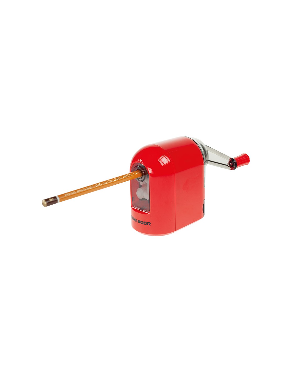Temperamatite da tavolo a manovella dotato di fresa in acciaio, serbatoio e morsetto per fissarlo al tavolo.