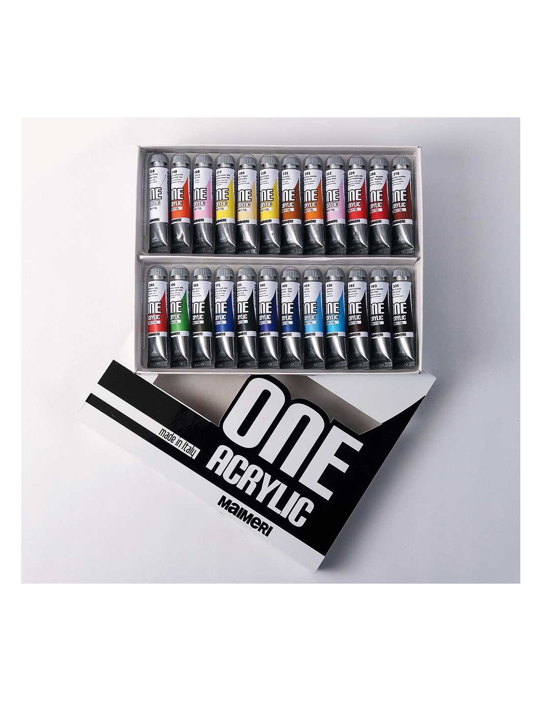 ONE Acrylic è una gamma di 42 colori acrilici disponibile solo in set, perfetta per studenti e principianti, molto conveniente. E’ stata studiata con un particolare bilanciamento tra resina acrilica e pigmento in maniera da ottenere un prodotto che, più di ogni altro acrilico entry level, garantisca un ottimo rapporto qualità-prezzo. Sono colori a base di acqua, non contengono solventi o altri componenti ritenuti nocivi per la salute o per l’ambiente.