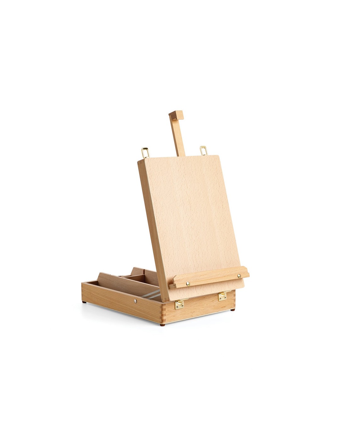 Cassetta cavalletto in legno con 7 tubi di colore olio diluibile ad acqua da 37ml, 1 pennello, 1 spatola, 1 confezione di fusaggine, 2 medium, 1 album con 10 fogli formato A4 preparati per olio