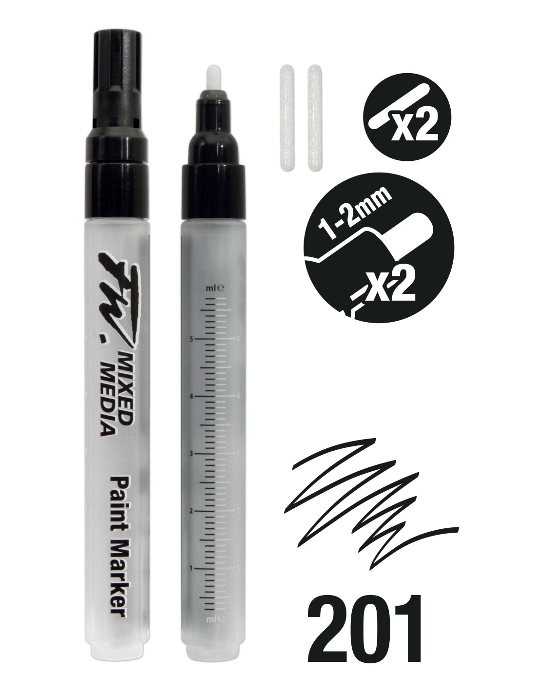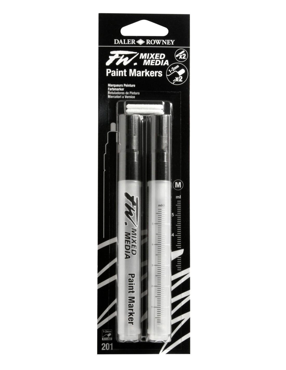 I marcatori Daler-Rowney FW Mixed Media Paint Markers sono pennarelli ricaricabili che possono essere utilizzati con un'ampia varietà di supporti liquidi come inchiostri acrilici come inchiostri acrilici FW, colori ad acquerello o inchiostri da disegno, o riempiti con acqua per l'uso come frullatore di matite acquerellate. I marcatori FW Mixed Media vuoti possono quindi creare un numero illimitato di singoli colori attraverso la miscelazione e la diluizione.