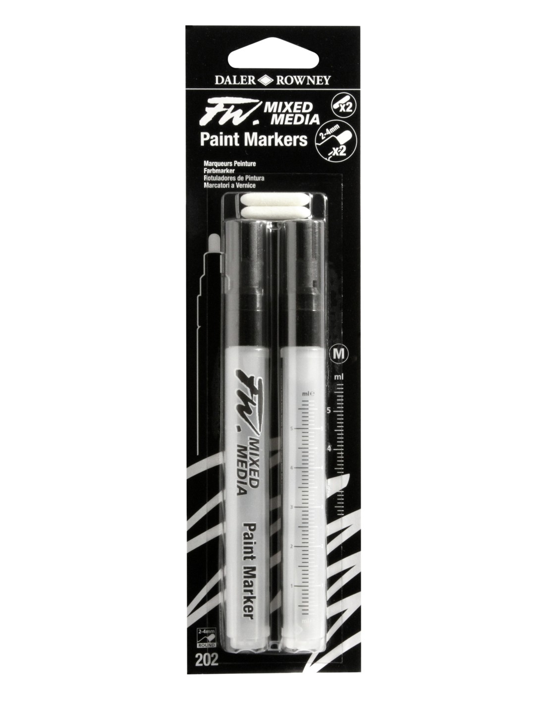 I marcatori Daler-Rowney FW Mixed Media Paint Markers sono pennarelli ricaricabili che possono essere utilizzati con un'ampia varietà di supporti liquidi come inchiostri acrilici come inchiostri acrilici FW, colori ad acquerello o inchiostri da disegno, o riempiti con acqua per l'uso come frullatore di matite acquerellate. I marcatori FW Mixed Media vuoti possono quindi creare un numero illimitato di singoli colori attraverso la miscelazione e la diluizione.