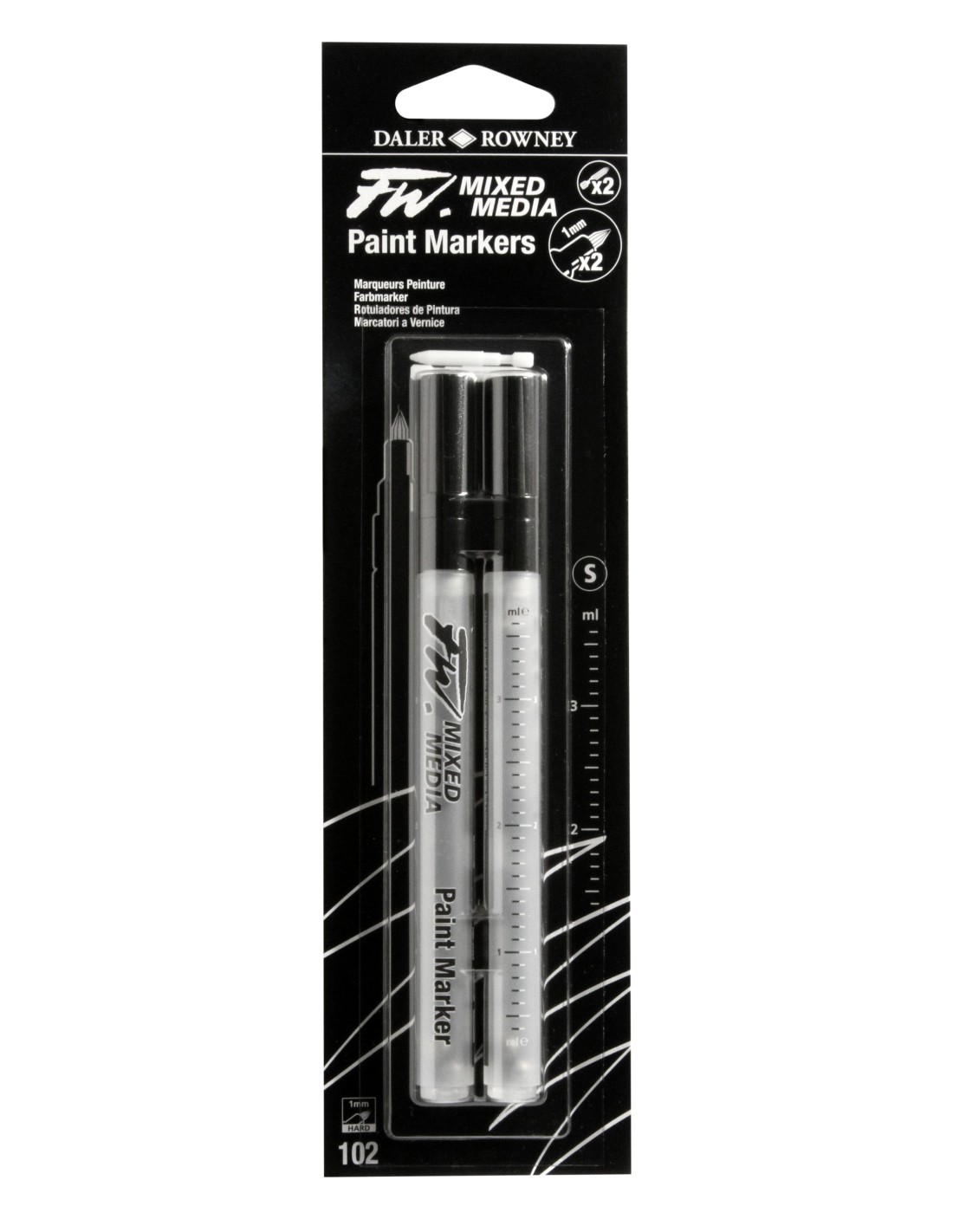 I marcatori Daler-Rowney FW Mixed Media Paint Markers sono pennarelli ricaricabili che possono essere utilizzati con un'ampia varietà di supporti liquidi come inchiostri acrilici come inchiostri acrilici FW, colori ad acquerello o inchiostri da disegno, o riempiti con acqua per l'uso come frullatore di matite acquerellate. I marcatori FW Mixed Media vuoti possono quindi creare un numero illimitato di singoli colori attraverso la miscelazione e la diluizione.
