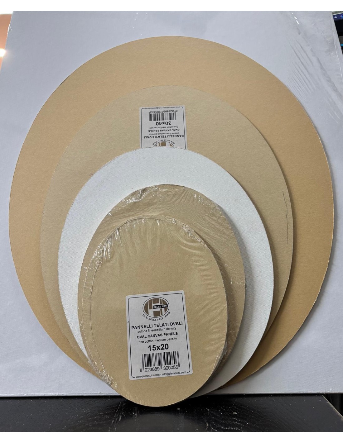 Pannelli tranciati in forma ovale e rivestiti da un lato da tela a grana fine con preparazione universale, mentre sull'altra è applicata una carta per bilanciare e rifinire il supporto